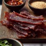 Start by freezing your beef for 30 minutes. This step is crucial as it firms up the meat, making it much easier to slice thinly and evenly. Then, cut the beef into strips about 1/8 to 1/4 inch thick, always slicing against the grain. This ensures a jerky texture that’s tender yet chewy in all the right ways, avoiding toughness.