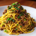 This Asian-Style Ground Beef Spaghetti is a delicious fusion dish combining tender ground beef with savory Asian sauces and fresh vegetables, tossed with perfectly cooked spaghetti noodles. It’s a quick and easy weeknight meal bursting with bold flavors, enhanced by garlic, ginger, and a touch of heat from sriracha. Garnished with green onions and toasted sesame seeds, this dish brings a satisfying twist to classic spaghetti.