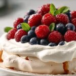 - Whip the Cream and Assemble: In a clean bowl, whip the heavy cream with sugar until stiff peaks form. Spread the whipped cream generously over the cooled pavlova base. Top with fresh mixed berries, slice carefully, and serve immediately to enjoy the contrast of crisp meringue, silky cream, and juicy berries.