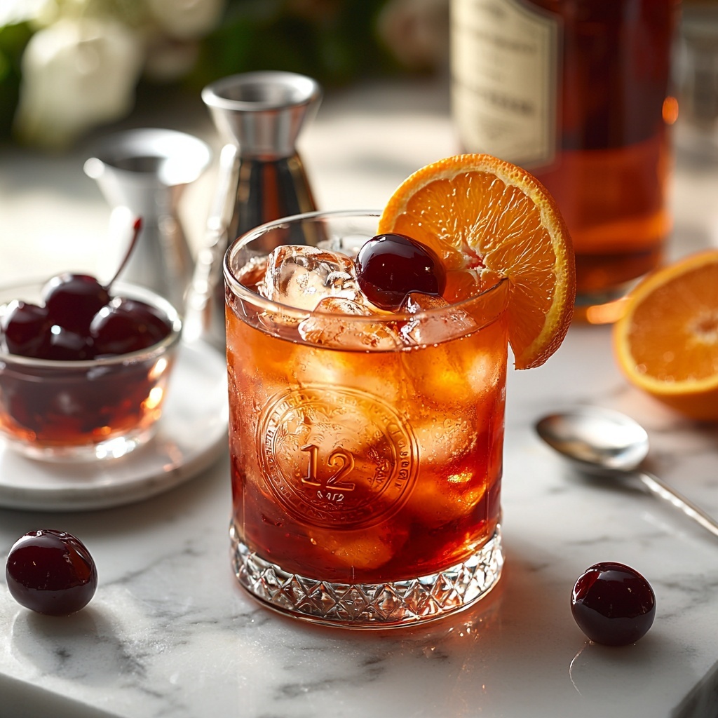 The classic garnish of Luxardo cherries and a fresh orange peel is more than just decoration—it adds a final burst of fruitiness and citrus aroma with every sip. The orange peel’s oils brighten the cocktail’s scent, making the drinking experience fully immersive.
