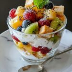 A refreshing and colorful breakfast fruit salad featuring a mix of fresh berries, kiwi, pineapple, and grapes, lightly dressed with citrus juice and honey or maple syrup. Perfect for a healthy start to your day, served chilled and optionally topped with Greek yogurt or granola for added texture and flavor.