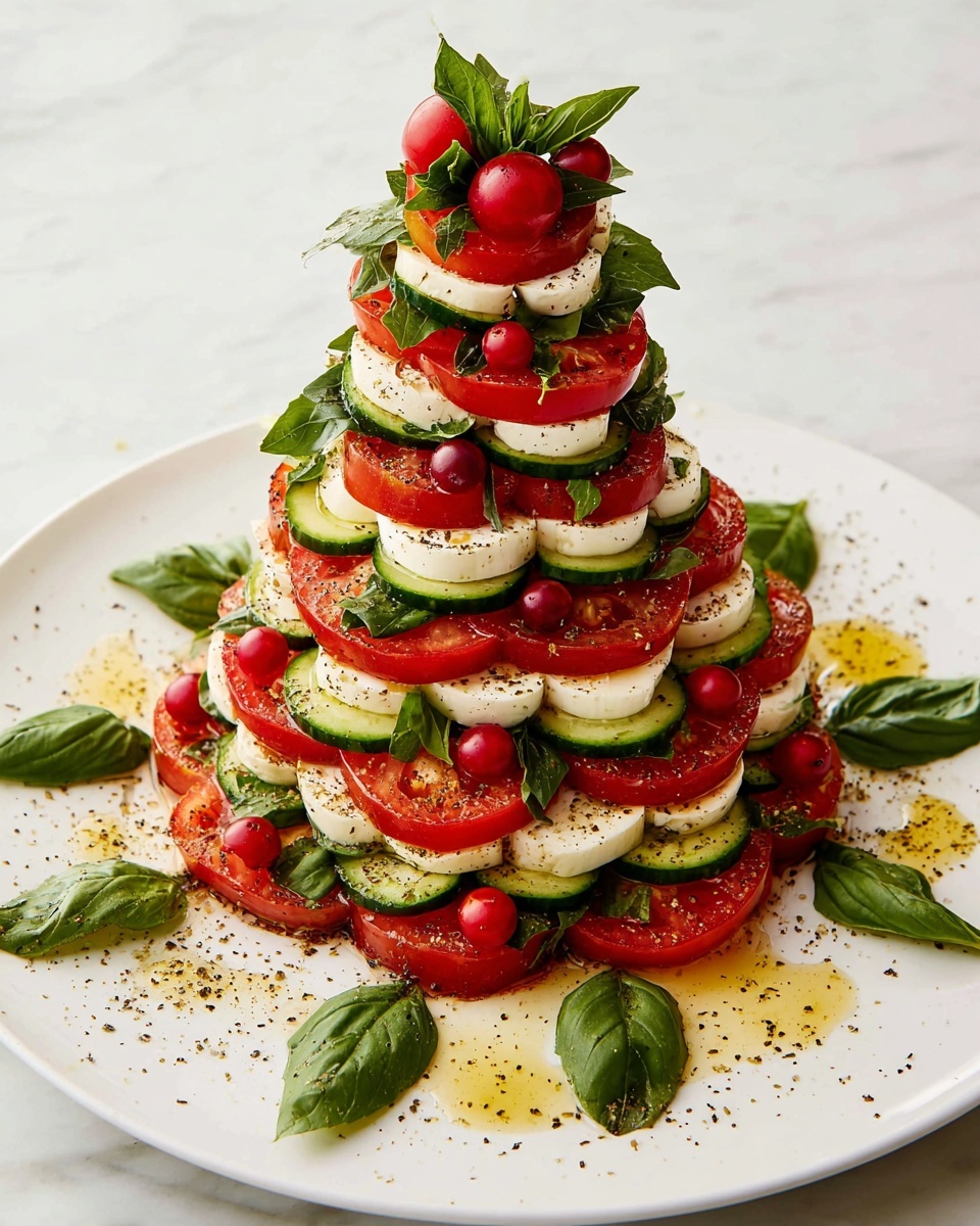 Drizzle the entire Caprese Christmas Tree with a generous amount of quality extra virgin olive oil for that glossy, appetizing finish. Sprinkle flaky sea salt and freshly cracked black pepper on top to highlight every fresh bite. Garnish the base with additional basil leaves, pine nuts, or drizzle a balsamic glaze if you want an extra layer of sweetness and color contrast.