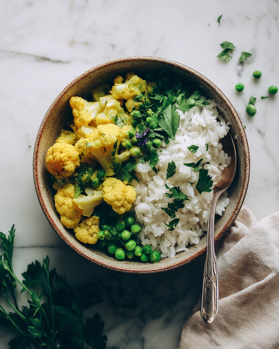 Freshly chopped cilantro is the most classic and uplifting garnish for this Cauliflower Curry Recipe—it adds a fresh, herbal contrast to the rich, creamy curry. You can also sprinkle toasted cashews or a dollop of dairy-free yogurt to add a bit of texture and creaminess.