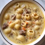 A rich and creamy Cheeseburger Soup featuring browned ground beef, tender potatoes and carrots, and a sharp cheddar cheese finish. Perfect for a comforting meal that combines classic cheeseburger flavors in a warm, hearty soup.