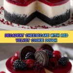 This decadent Cheesecake with Red Velvet Cookie Dough combines a rich, creamy cheesecake filling with pockets of soft, flavorful red velvet cookie dough studded with mini chocolate chips. Set on a chocolate sandwich cookie crust, this layered dessert blends classic flavors and textures to create an irresistible treat perfect for special occasions or indulgent gatherings.