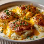 A comforting and hearty Cheesy Chicken Biscuit Casserole featuring tender shredded chicken, creamy cheese sauce, and fluffy biscuit pieces baked to golden perfection. Perfect for an easy weeknight dinner or a crowd-pleasing meal.