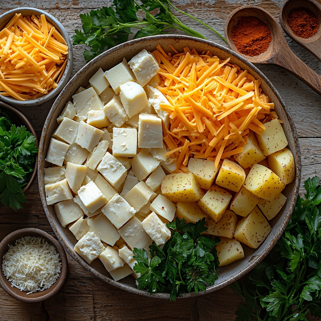 In a large mixing bowl, combine the diced potatoes with cream of chicken soup, garlic powder, onion powder, and half of the shredded cheese. This mixture is where the comfort happens—the soup and spices coat every potato chunk. Next, gently fold in the crumbled chicken, making sure everything is well incorporated before the next step.