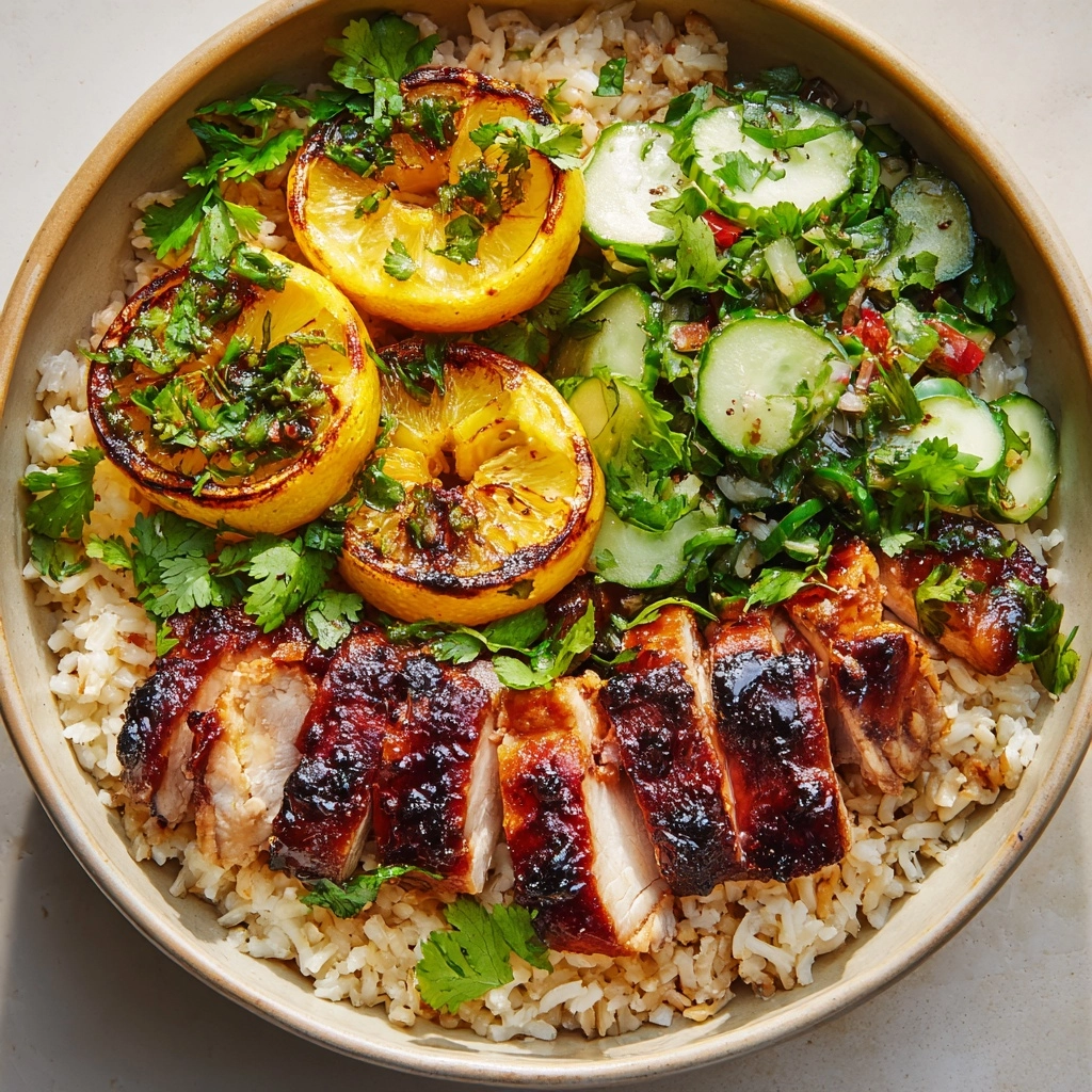 Chili Crisp Chicken Bowls are a flavorful and vibrant meal combining tender, marinated chicken thighs cooked with aromatic garlic and ginger, served atop fluffy jasmine or basmati rice. Enhanced with a spicy and savory chili crisp sauce, these bowls are topped with fresh shredded carrots, crisp cucumber, shelled edamame, and green onions. Garnished with sesame seeds and lime wedges, this Asian-inspired dish is perfect for a quick weeknight dinner or meal prep.