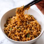 While the noodles are cooking, whisk together olive oil, soy sauce, fresh lime juice, honey (or agave), minced garlic, and red pepper flakes in a small bowl. The combination of these ingredients creates a bright, savory, and slightly sweet dressing that will elevate the noodles instantly. Take a moment to taste and add salt or pepper if necessary—this step lets you personalize your flavor balance before mixing it with the noodles.
