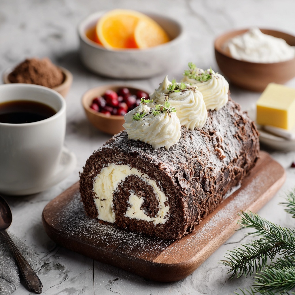 This Classic Yule Log Cake (Bûche de Noël) is a traditional Christmas dessert featuring a rich and tender chocolate sponge cake rolled with creamy whipped filling, crowned with a luscious chocolate buttercream to resemble a festive log. It’s elegantly decorated with seasonal touches like cranberries, meringue mushrooms, and rosemary, making it the perfect centerpiece for your holiday table.