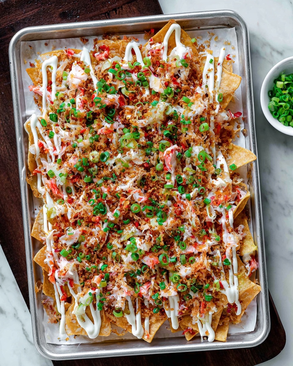 Begin by softening the cream cheese to room temperature for easier mixing. In a medium bowl, blend the cream cheese, sour cream, soy sauce, garlic powder, and onion powder until the mixture is smooth and creamy. Gently fold in the lump crab meat and chopped green onions so the flavors marry beautifully without breaking up the delicate crab too much. This mixture is the heart of your Crab Rangoon Nachos Recipe.