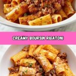 This creamy rigatoni recipe features a rich and flavorful sauce made with Boursin garlic and herb cheese, ground beef or Italian sausage, and a savory tomato base. It’s a comforting one-pot meal that combines tender pasta with a luscious, creamy sauce, topped with fresh parmesan and parsley for added brightness.