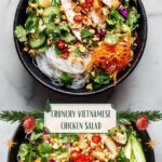 A vibrant and refreshing Crunchy Vietnamese Chicken Salad featuring shredded cabbage, carrots, fresh herbs, and roasted peanuts, tossed with tender sautéed chicken and a tangy, sweet, and savory dressing made with fish sauce, lime juice, and rice vinegar. This salad offers a delightful combination of textures and flavors perfect for a light lunch or dinner.