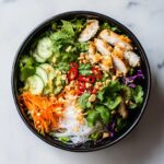 While your chicken cools, grab a large bowl and combine the shredded cabbage and carrots. Toss them well so every bite has that crisp foundation. Next, add the fresh cilantro and mint leaves. Their herbal freshness brings a wonderfully vibrant contrast to the crunchy veggies and juicy chicken.