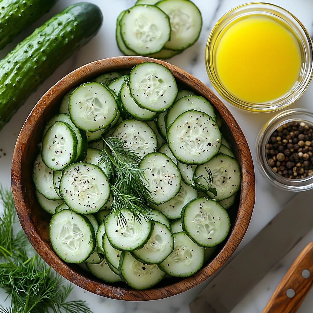 Start with the star of the salad by washing your cucumbers thoroughly to remove any dirt or residue. Then, slice them thinly using a sharp knife or, even better, a mandoline for perfect, even slices. The thinner, the better—this helps the cucumbers soak up that lovely dressing while keeping their classic crunch.