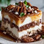 This Decadent Pecan Pie Lasagna is a rich and layered dessert that combines the flavors and textures of pecan pie with creamy cheesecake and whipped topping. Featuring a crunchy graham cracker crust, a smooth cream cheese layer, a gooey pecan pie filling, and a generous topping of whipped cream and pecans, it’s the perfect indulgent treat for special occasions or any time you want a deliciously unique dessert.