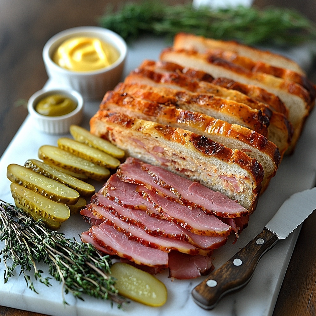 - Assemble the Sandwich: On the bottom half of the bread, layer Swiss cheese first, then ham, roasted pork, and dill pickle chips. Add another layer of Swiss cheese on top before placing the other half of the bread over the fillings.