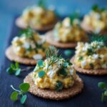 Cut your cooled dill bread slices into small squares or rounds that fit comfortably in your hand—bite-sized is the aim here! Take each piece, dollop a generous spoonful of egg salad, and top with a delicate slice of apple. If you’re feeling fancy, garnish with an extra sprig of dill for that fresh herbal finish.