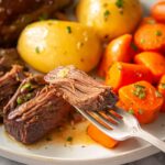Once the cooking time is up, it’s time to make the gravy that will tie everything together. Scoop 2 tablespoons of the cooking liquid into a small bowl, stir in the cornstarch until fully dissolved, then stir this slurry back into the pot. The sauce will thicken beautifully, coating the roast and vegetables with a glossy finish. Taste and adjust seasoning with salt and pepper as needed, ensuring every bite bursts with rich, balanced flavor.