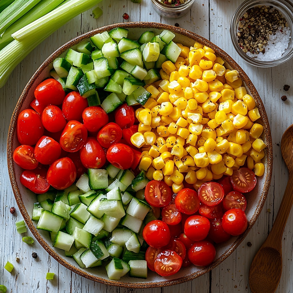 In a large mixing bowl, add the drained shoepeg corn, halved cherry tomatoes, diced green bell pepper, and chopped cucumber together. If you’re using celery seed, sprinkle it in now to give your salad an extra hint of herby flavor.