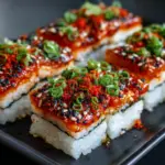 - Prepare Rice Layer: In a bowl, combine the cooked sushi rice with rice vinegar, sugar, and salt. Mix thoroughly to evenly season the rice. Then press this mixture firmly into the bottom of an 8×8-inch baking dish, creating an even layer.