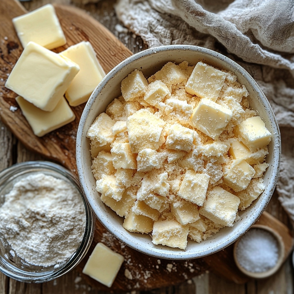 Start by cubing your cold unsalted butter and keep it refrigerated until you’re ready to incorporate it. This cold butter is the secret to flaky layers—when baked, the cubes create tiny pockets of steam that puff up the dough beautifully.