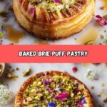 This elegant Garden Party Baked Brie Tart features a creamy wheel of brie wrapped in buttery puff pastry, baked to golden perfection, then topped with sweet honey, crunchy pistachios, and vibrant edible flowers for a stunning appetizer that’s perfect for entertaining.