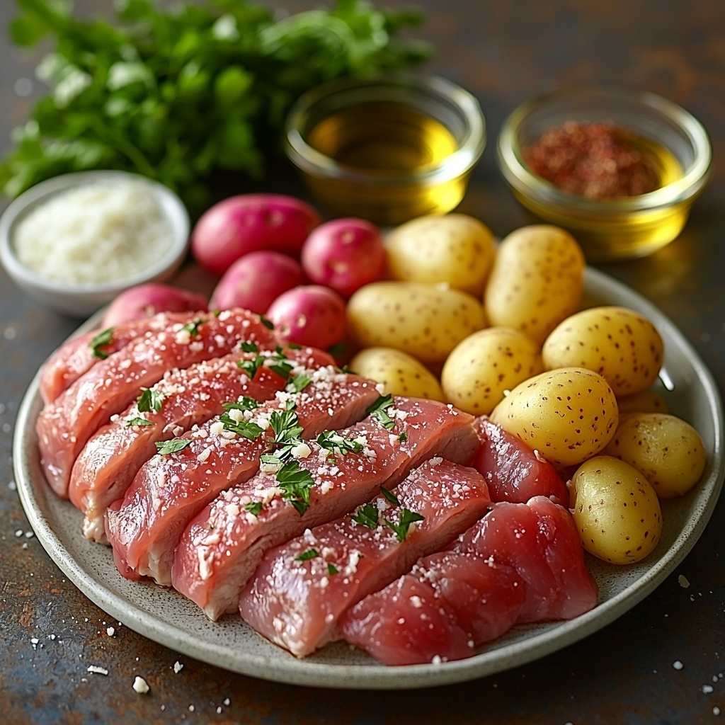 - Prepare Potatoes: Halve the baby Yukon Gold or red potatoes. In a separate bowl, toss them with 3 tablespoons olive oil, minced garlic cloves, grated Parmesan cheese, ½ teaspoon salt, and ¼ teaspoon black pepper until well coated.