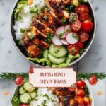 Harissa Honey Chicken Bowls feature tender baked chicken breasts coated in a flavorful harissa and honey spice paste, served over a vibrant bed of rice mixed with fresh cherry tomatoes, cucumber, red onion, cilantro, and finished with a drizzle of olive oil, lemon juice, and crumbled feta cheese. This dish offers a perfect balance of spicy, sweet, and fresh flavors, making it a satisfying and healthy meal ideal for lunch or dinner.