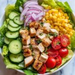 Grab a large bowl and toss together your choice of greens, sliced red onion, halved cherry tomatoes, crisp cucumber, creamy avocado slices, and sweet corn. Then, add the remaining ranch dressing to the mix and toss everything gently but thoroughly so each ingredient gets evenly coated. Finally, add the warm cooked chicken on top or fold it right in—either way, you’re looking at a colorful, vibrant salad that beckons to be devoured.