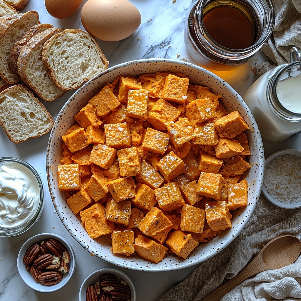Start by roasting or steaming your sweet potatoes until they’re tender, then mash them until smooth. Meanwhile, cut your stale bread into roughly one-inch cubes, making sure they’re dry enough to soak up all the custardy goodness without turning mushy.