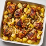 This Lemon Greek Chicken and Potatoes recipe features succulent bone-in, skin-on chicken thighs paired with tender, lemony potato wedges, all roasted together in one pan for a flavorful and hassle-free Mediterranean meal. Infused with garlic, oregano, thyme, and fresh lemon juice, it’s a perfect balance of citrusy brightness and savory herbs that delivers a hearty yet light dinner option.