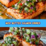A flavorful and elegant Miso Butter Salmon topped with a vibrant Sizzled Scallion Salsa Verde. The salmon is pan-seared to a golden brown and glazed with a rich miso butter, complemented perfectly by a fresh and tangy scallion salsa bursting with herbs and a hint of heat. This dish is quick to prepare and sure to impress at any dinner table.