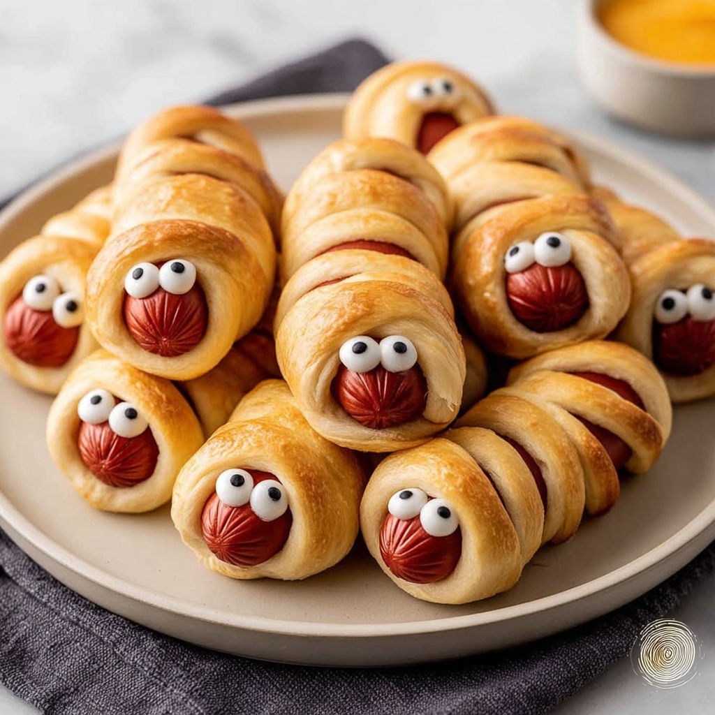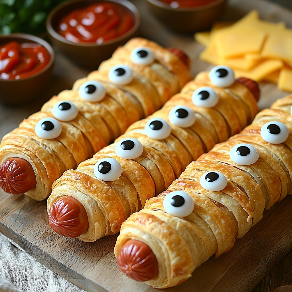 Serve these playful mummies warm alongside your favorite dipping sauces like ketchup or mustard. Their fun appearance and irresistible taste make them the perfect snack to brighten up any mealtime or party table.