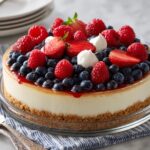This no-bake cheesecake flag cake is a visually stunning dessert perfect for patriotic celebrations. Featuring a rich graham cracker crust with a cocoa hint, a creamy lemon-infused mascarpone and cream cheese filling, and topped with fresh strawberries and blueberries arranged like the American flag, this dessert requires no oven, making it easy and delicious to prepare.