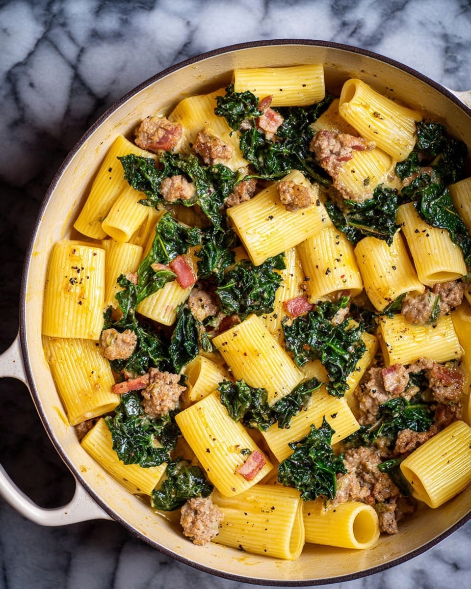 How to Serve One Pot Rigatoni with Sausage, Bacon, and Kale Recipe