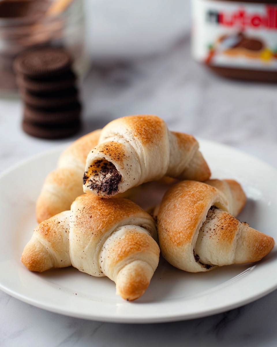 Arrange the stuffed crescent rolls on a pretty platter with fresh berries or edible flowers for a stunning dessert spread. They also work wonderfully as a party appetizer, paired with small bowls of extra Nutella or Oreo crumbs for dipping or sprinkling.