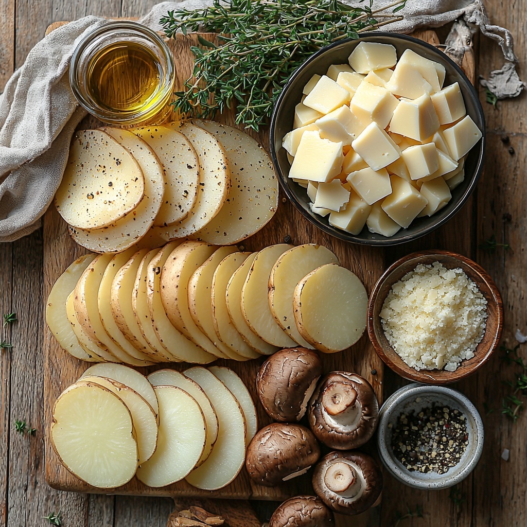This Potato & Mushroom Gratin is a creamy, cheesy baked casserole featuring thinly sliced russet potatoes layered with sautéed portabello mushrooms and a rich herb-infused cream sauce. Topped with a blend of Swiss, Gruyere, and Parmesan cheeses, this gratin is golden and bubbly after baking, perfect as a comforting side dish or elegant vegetarian main course.