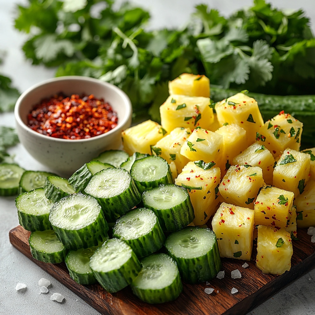 Start by washing and drying your cucumber and pineapple thoroughly. This ensures they’re clean and ready to shine as the stars of the dish.