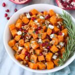 This Roasted Butternut Squash with Goat Cheese recipe combines sweet and savory flavors with the earthy taste of roasted butternut squash, crunchy nuts, fresh rosemary, tangy goat cheese, and juicy pomegranate arils. It’s a vibrant and festive dish perfect as a side or a light vegetarian entree, showcasing a balance of textures and flavors with minimal prep and simple ingredients.