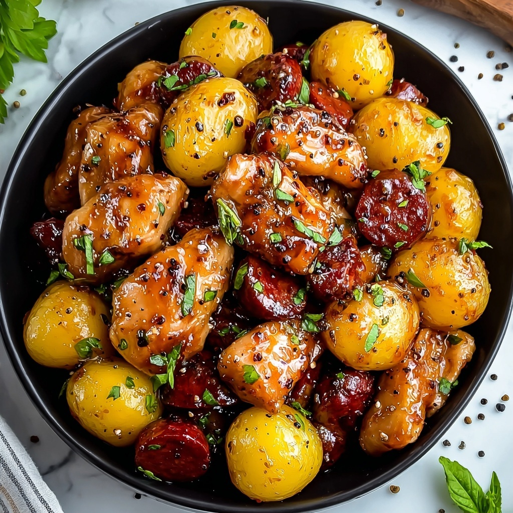 Start by preheating your oven to 400°F (200°C). While it’s warming up, toss the chicken breasts and halved baby potatoes together in a large bowl with olive oil, balsamic vinegar, lemon juice, lemon zest, minced garlic, thyme, rosemary, salt, and black pepper. Make sure every piece is evenly coated—this marinade is what will infuse the chicken and potatoes with that signature punch of tangy, herby flavor. Let it sit for 10 minutes if you have time; if not, just get it into the oven.