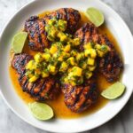 This Spicy Grilled Mango Chicken recipe features juicy boneless, skinless chicken breasts marinated in a vibrant, sweet and spicy mango-based sauce. The marinade combines ripe mangoes, lime juice, honey, and a blend of chili powder, cumin, paprika, and cayenne pepper for a flavorful kick. Grilled to perfection, this dish is garnished with fresh cilantro and served with lime wedges, making it a refreshing and delicious meal perfect for outdoor barbecues or a flavorful weeknight dinner.