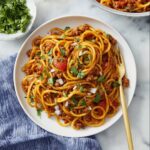 Remove the skillet from the heat and sprinkle chopped green onions and cilantro on top. These fresh garnishes add crunch, brightness, and a pop of vibrant color to your Taco Spaghetti Recipe.