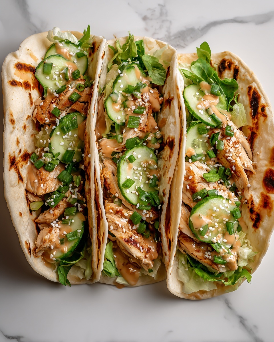 Reheat chicken gently in a skillet over medium-low heat to preserve juiciness. Warm tortillas separately in a pan or microwave. Add fresh creamy cucumber topping right before serving to maintain that fresh, crisp texture and vibrant flavor.