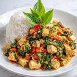 A flavorful and vibrant Thai Basil Tofu recipe featuring crispy pan-fried tofu stir-fried with fresh Thai basil, aromatic garlic, fiery bird’s eye chilies, and colorful bell pepper. This quick and easy stir-fry offers a delicious vegetarian twist on a classic Thai favorite, perfect for a satisfying weeknight meal served over steamed rice.