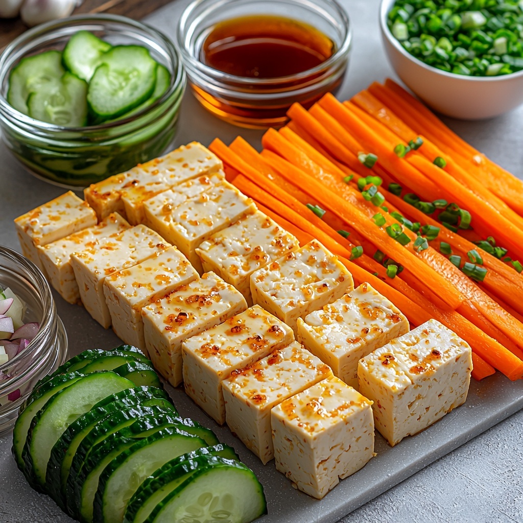 Using a mandolin or a sharp knife, slice the carrots into thin strips, then cut them into rectangles that mirror the tofu slices in size. This matching helps maintain balance when rolling. Next, slice the cucumbers into long, thin strips—these will be your fresh, crunchy wrappers.