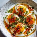 Turkish Eggs, also known as Cilbir, is a traditional Turkish breakfast dish featuring creamy yogurt with fresh herbs, topped with perfectly poached eggs and a sizzling spiced butter sauce. This dish balances refreshing herbs and tangy yogurt with rich, aromatic butter infused with chili flakes and smoked paprika, creating a delicious and comforting breakfast or brunch option.