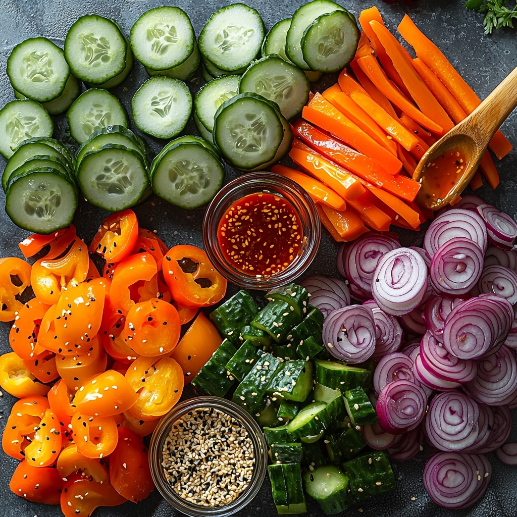 - Combine Vegetables: In a large mixing bowl, add the sliced Persian cucumbers, mini sweet bell peppers, julienned carrots, and thinly sliced shallots to prepare the salad base.