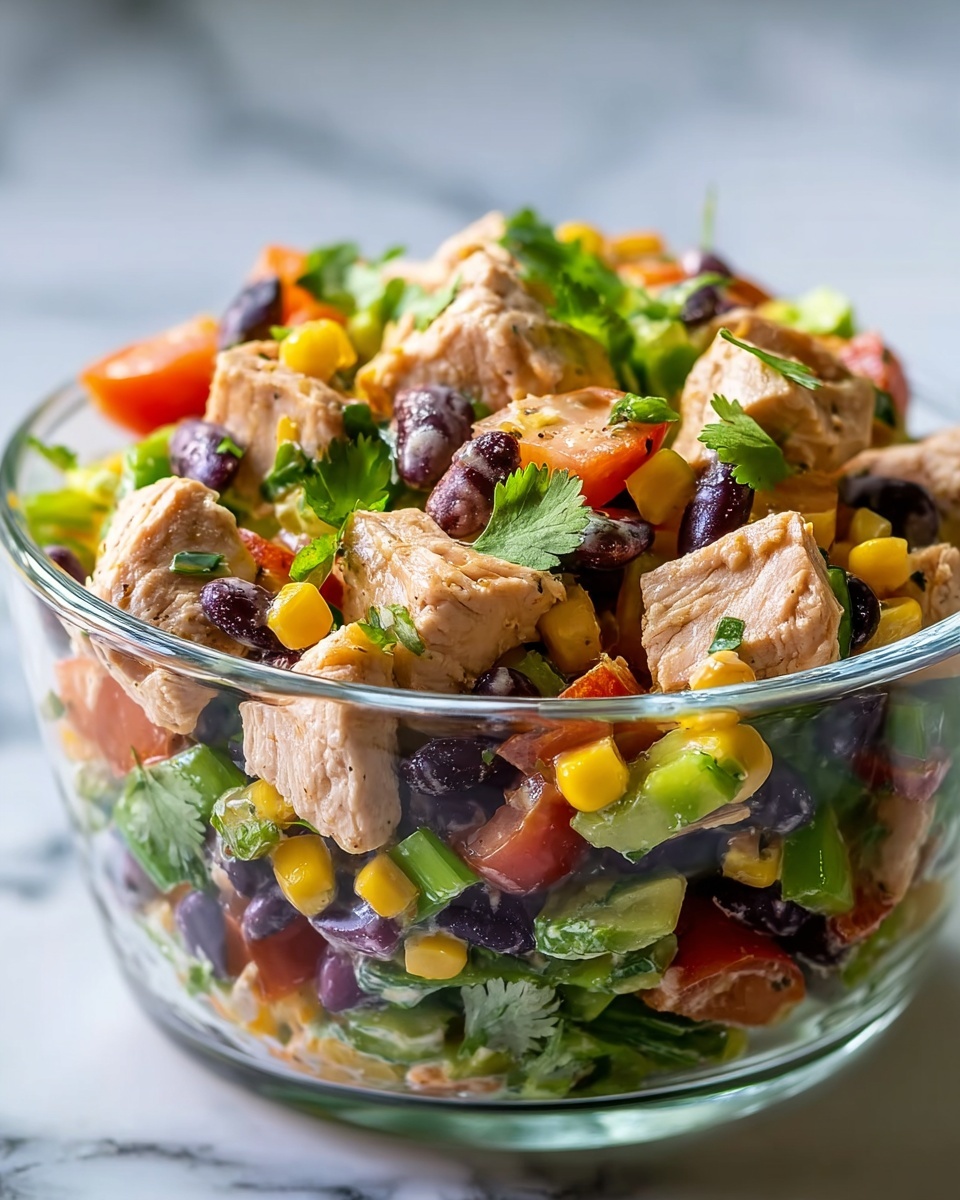 This Zesty Southwest Chicken Salad is a vibrant and healthy meal featuring grilled spiced chicken, fresh vegetables, and a tangy, flavorful dressing. Perfect for a quick lunch or light dinner, it combines crisp romaine lettuce, sweet corn, black beans, colorful bell peppers, creamy avocado, and a zesty lime vinaigrette with southwestern spices.